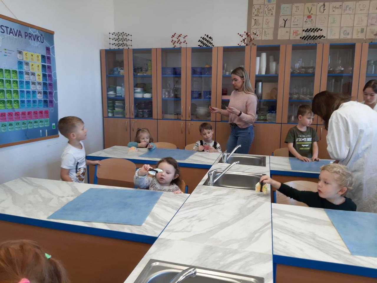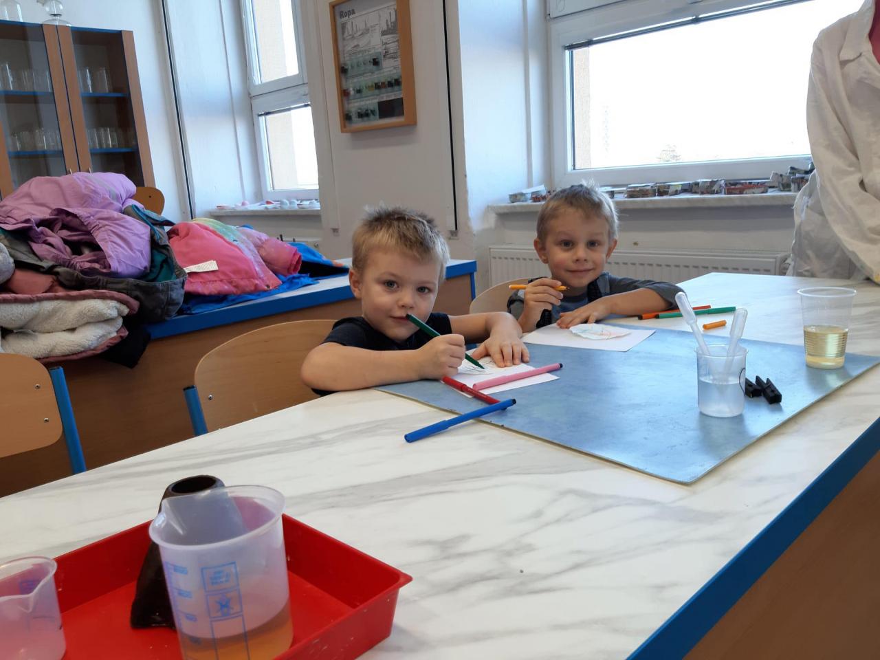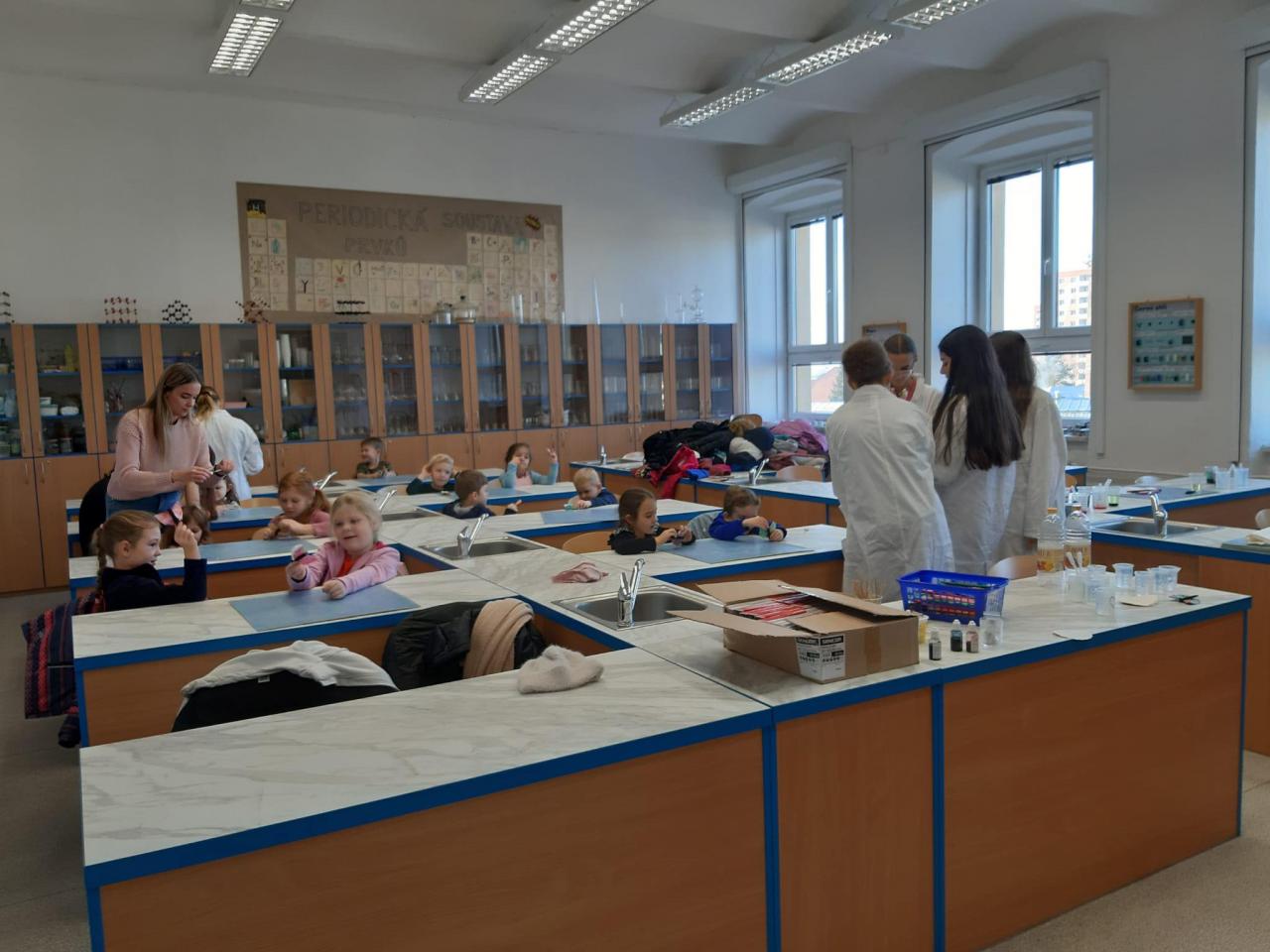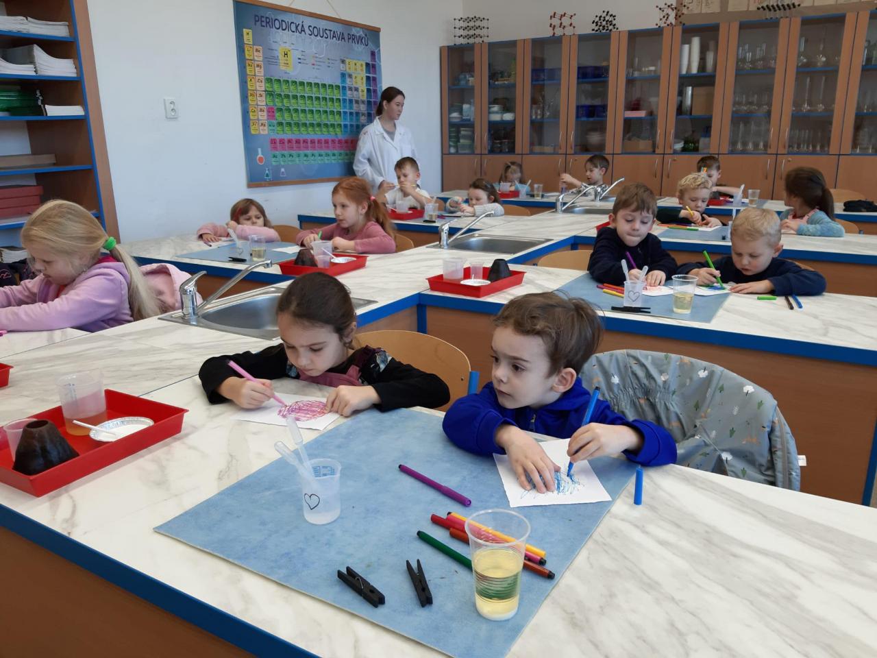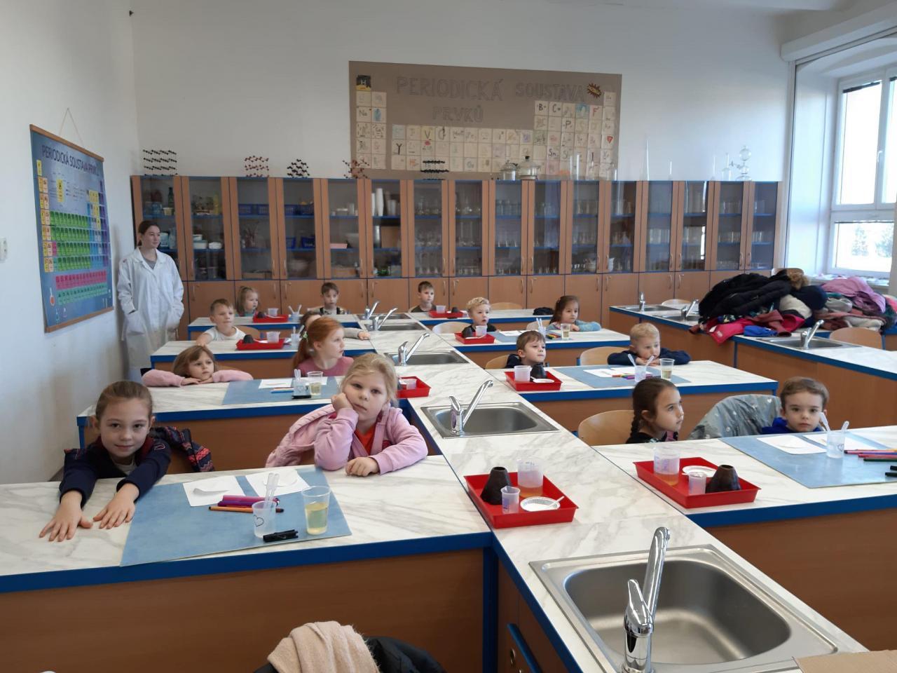 Dne 29.11. třida medvídků byla pozvaná paní uč.Novotnou na ukázku pokusů do učebny chemie na základní školu nám.Svobody.